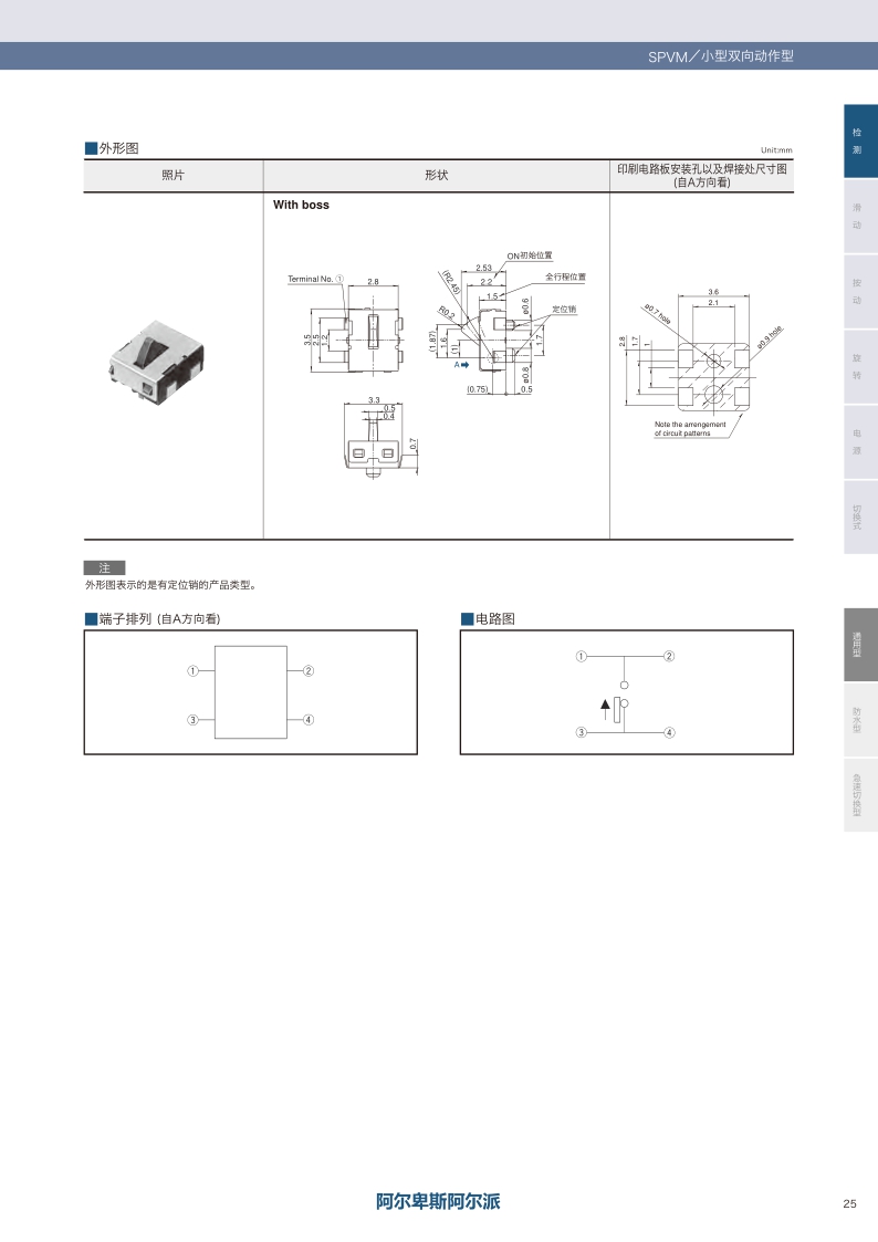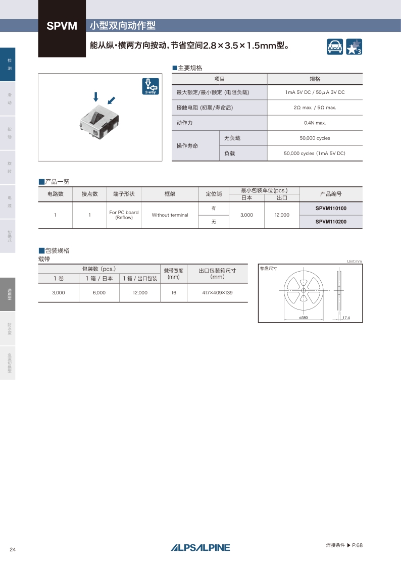 立式 / 小型雙向動作型 ? 最大額定值:1mA 5V DC ? 動作力:0.4N max. ? 操作壽命(無負載):50000 cycles。