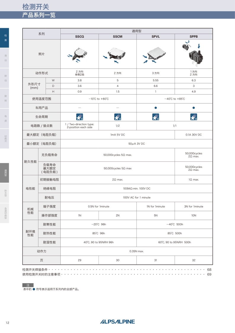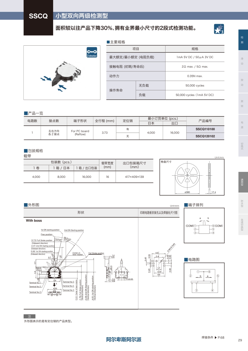 臥式 / 小型雙向兩級檢測型 ? 最大額定值:1mA 5V DC ? 動作力:0.35N max. ? 操作壽命(無負載):50000 cycles