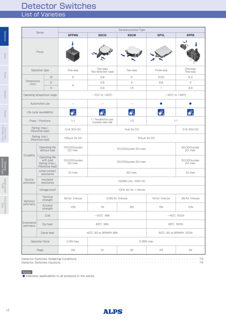 臥式 / 小型雙向輸出型 ? 最大額定值:1mA 5V DC ? 動作力:0.35N max. ? 操作壽命(無負載):50000 cycles。