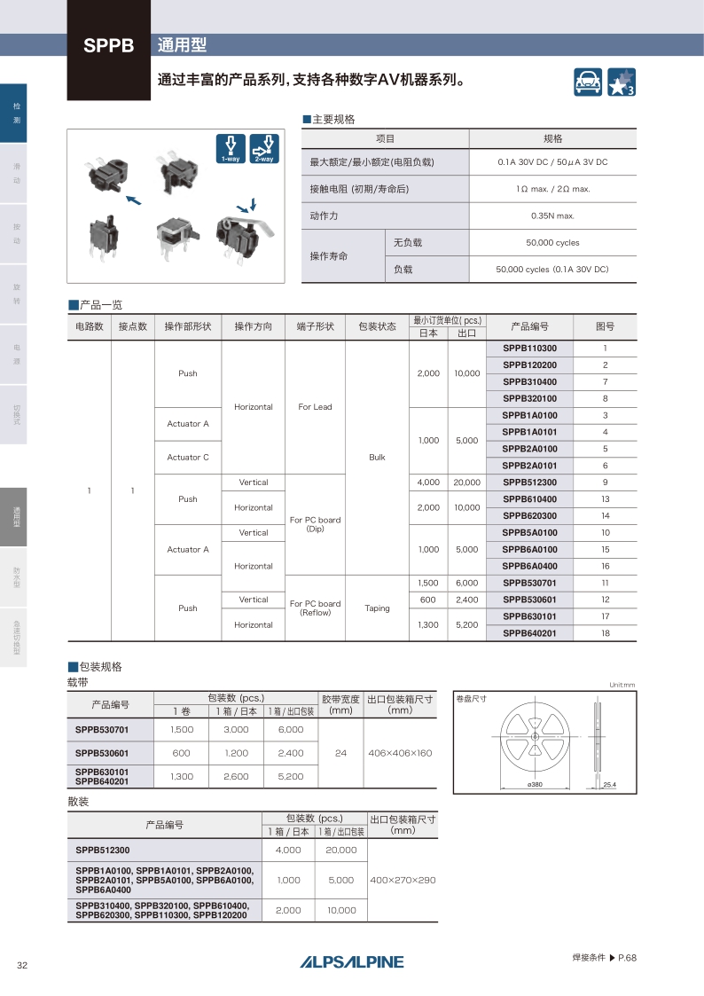 通用型 ? 最大額定值:0.1A 30V DC ? 動作力:0.35N max. ? 操作壽命(無負(fù)載):50000 cycles。