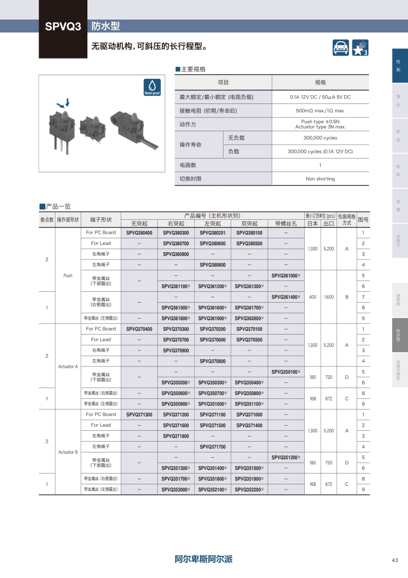 防水型 / 長行程型 ? 最大額定值:0.1A 12V DC ? 動作力:Push: 1±0.5N / Actuator: 3N max. ? 操作壽命(無負載):300000 cycles ? 防水及防塵型:IP67。