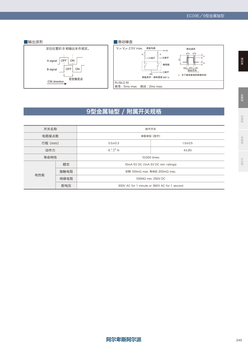 本體尺寸9.5mm的小型·立式,為安裝面積的空間節省化做出了貢獻。輸出:增量(A B 2相輸出) ? 外形尺寸:9mm size ? 定位數:30 ? 脈沖數(位置數):15 ? 操作壽命:15000 cycles ? 最大額定值:10mA 5V DC。