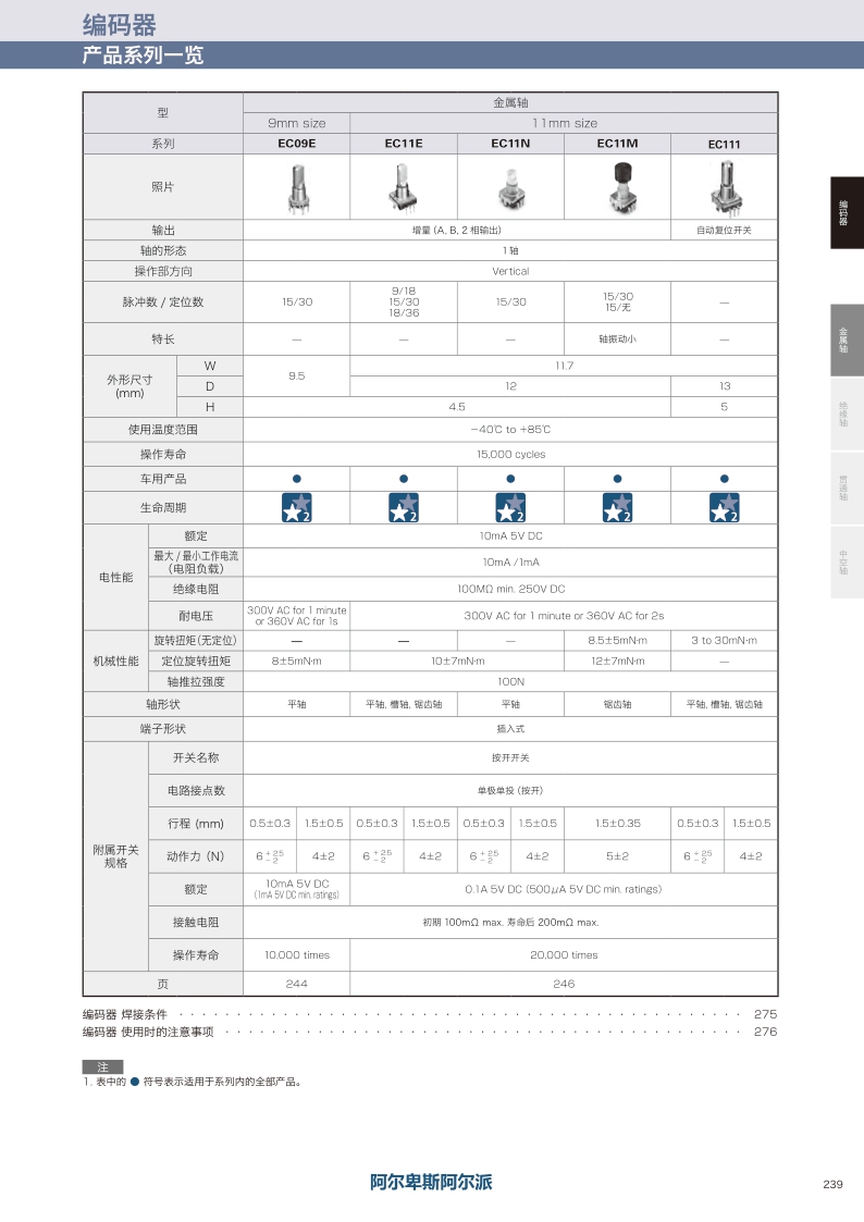 產品編號 照片 操作部方向 操作部形狀 操作部長度 定位數 脈沖數 按開開關 按開開關行程 尺寸