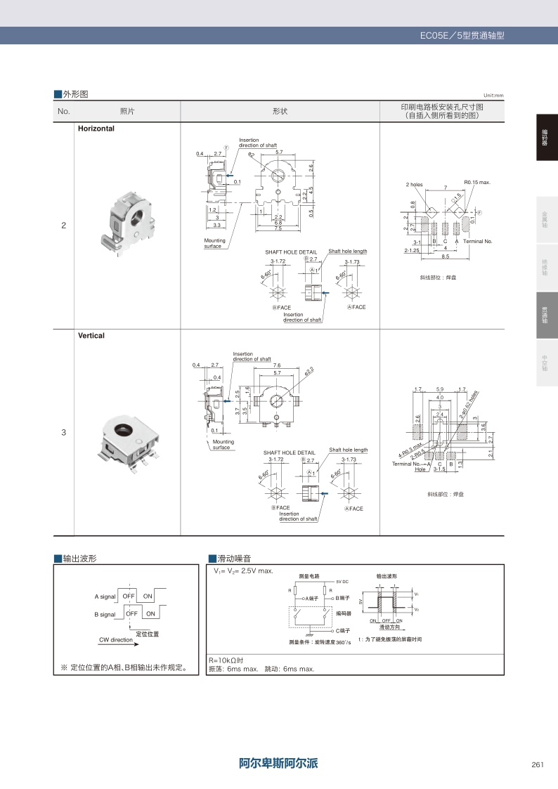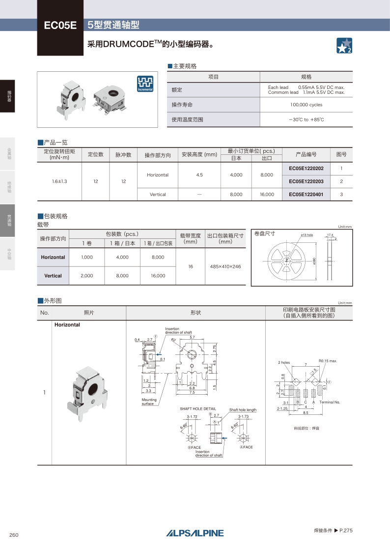 采用 DRUMCODE™的小型編碼器,輸出:增量(A B 2相輸出) ? 外形尺寸:5mm size ? 定位數:12 ? 脈沖數(位置數):12 ? 操作壽命:100000 cycles ? 最大額定值:0.55mA 5.5V DC。
