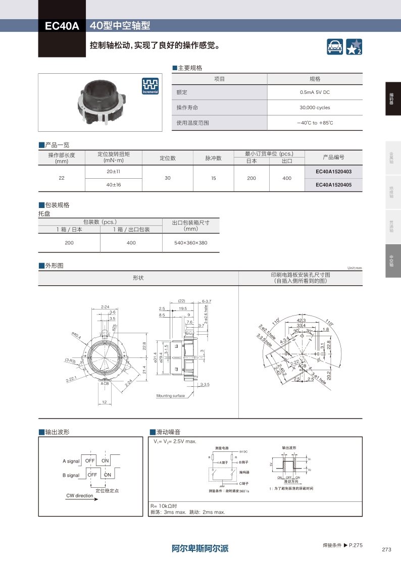 EC40A系列控制軸松動,實現了良好的操作感覺。輸出:增量(A B 2相輸出) ? 外形尺寸:40mm size ? 定位數:30 ? 脈沖數(位置數):15 ? 操作壽命:30000 cycles ? 最大額定值:0.5mA 5V DC。