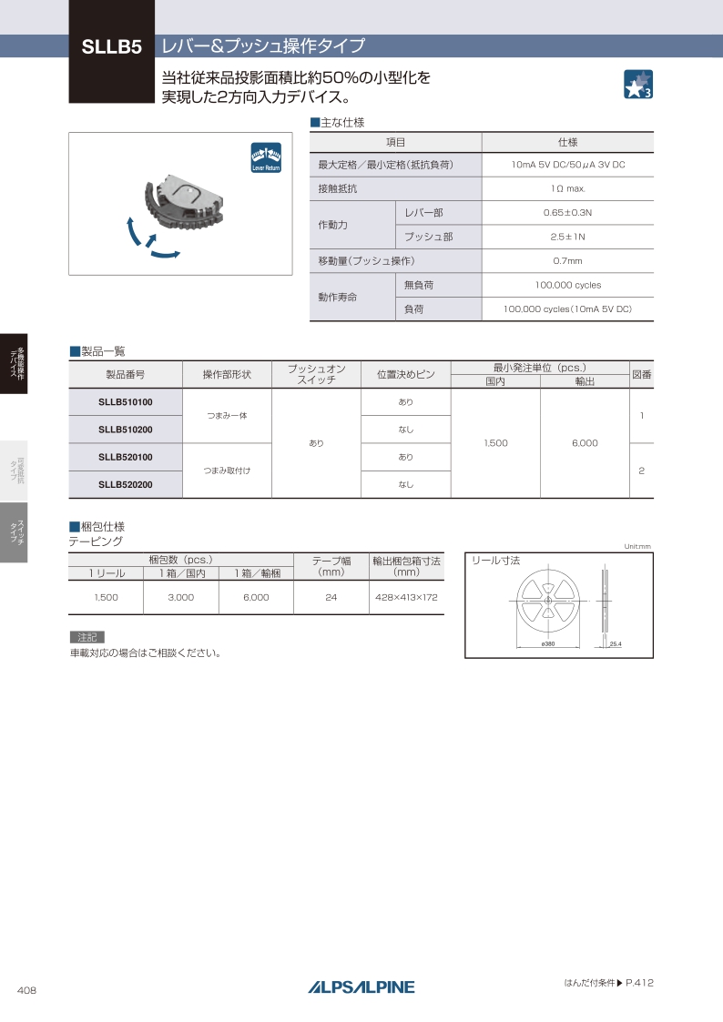 產品編號 照片 操作軸數 軸材質 操作部形狀 按動ON開關 動作力 行程(中心按動) 定位銷 接觸電阻 尺寸(W×D×H)