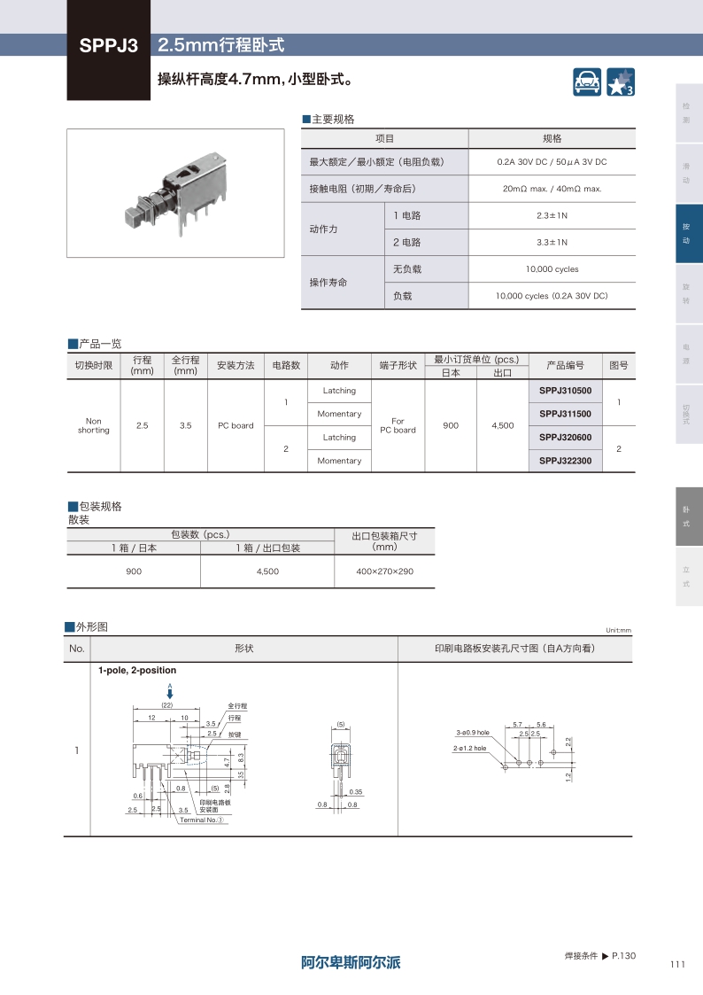 SPPJ320600 照片 Non shorting 2.5mm 3.5mm 3.3±1N PC board 2 Latching For PC board 12.0×6.6×8.3mm