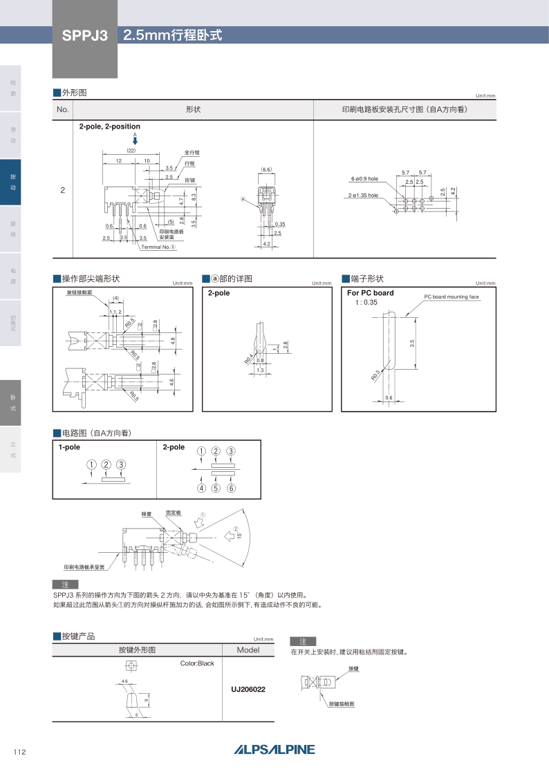 操縱桿高度4.7mm 小型臥式?操作方向:Horizontal ? 最大額定值:0.2A 30V DC ? 行程:2.5mm ? 電路數:1/2-pole。