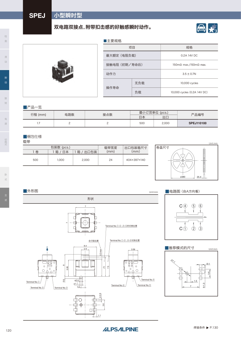 雙電路雙接點,附帶扣擊感的好觸感瞬時動作。小型瞬時型 SPEJ系列型號:SPEJ110100