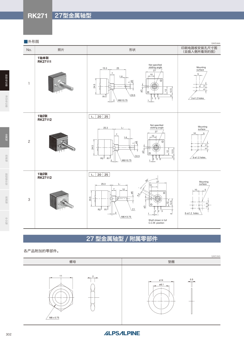RK271系列卓越的操作感覺高特性電位器。型:金屬軸 ? 外形尺寸:27型 ? 電阻體數:單聯,2聯 ? 附屬開關:無。