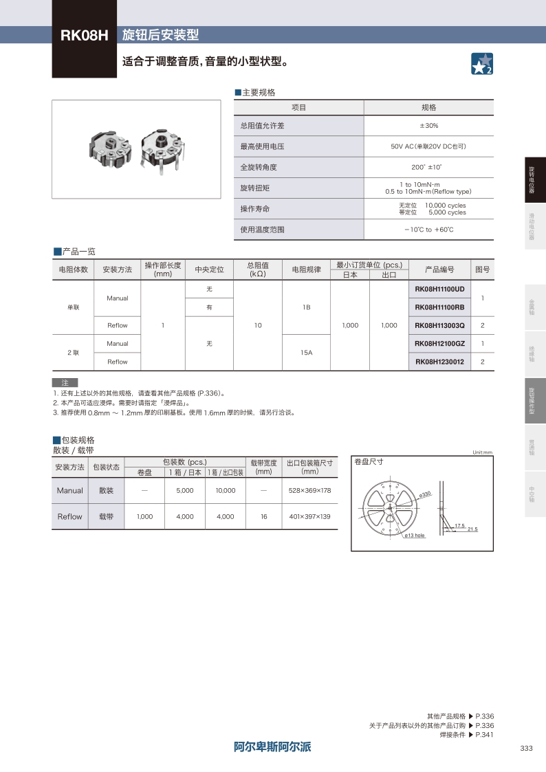 RK08H系列適合于調整音質,音量的小型狀型。型:旋鈕后安裝 ? 外形尺寸:8型 ? 電阻體數:單聯,2聯 ? 附屬開關:無。