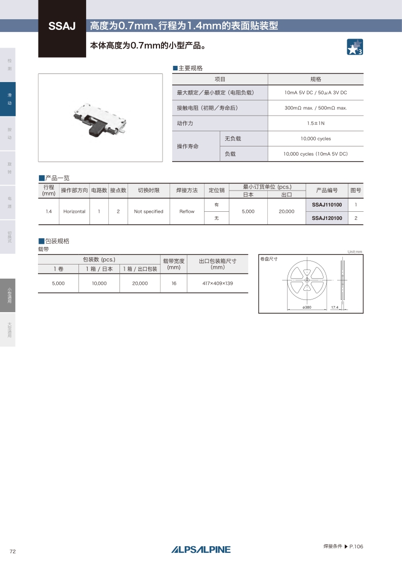 本體高度為0.7mm的小型產品,操作方向:Horizontal ? 安裝高度:0.7mm ? 行程:1.4mm ? 最大額定值:10mA 5V DC ? 電路數:1-pole。