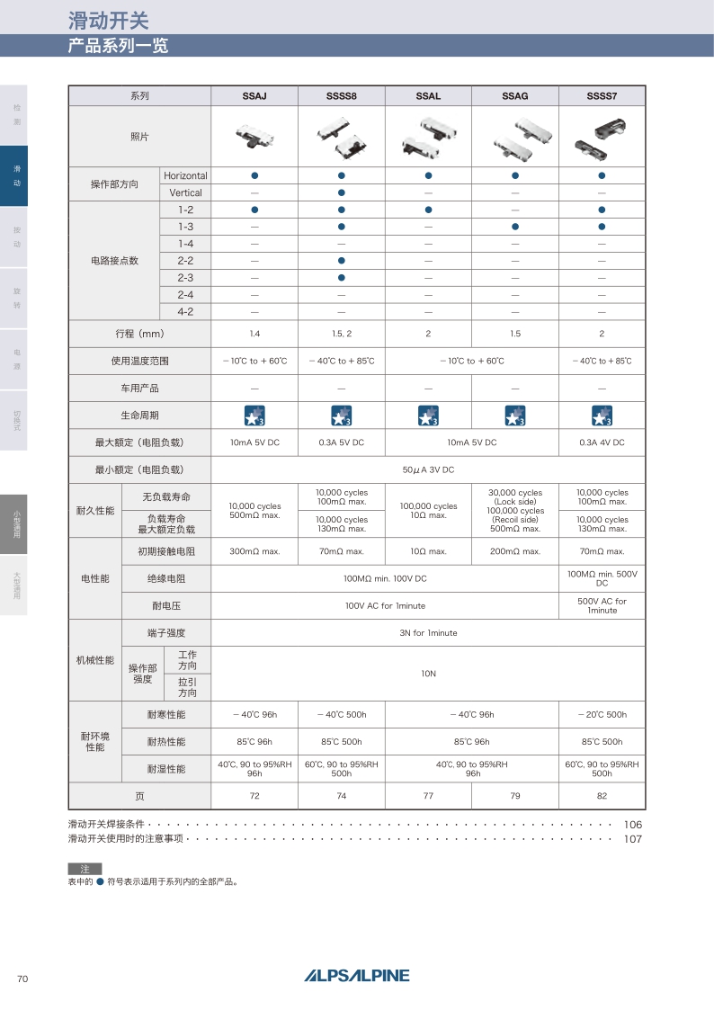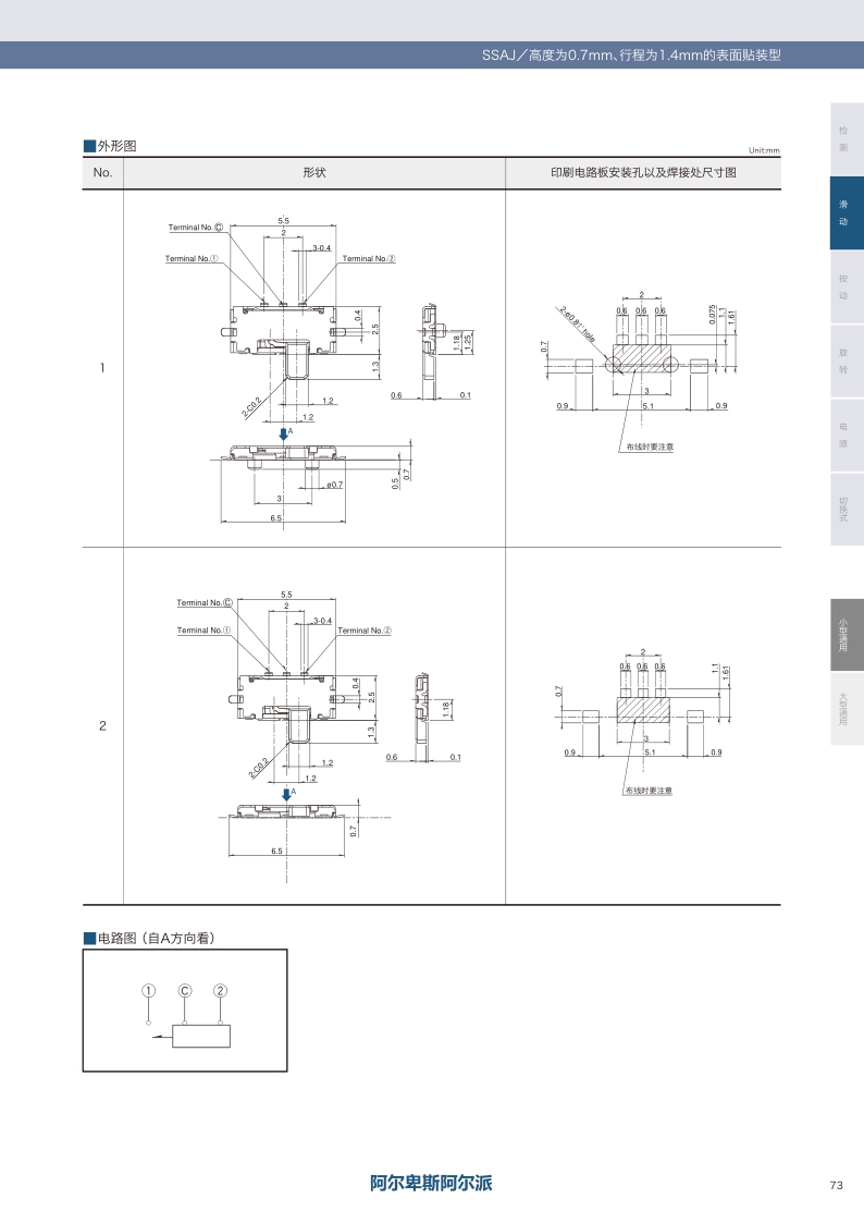 產品編號 照片 行程 操作部方向 電路數 接點數 動作力 切換時限 焊接方法 定位銷 尺寸(W×D×H)