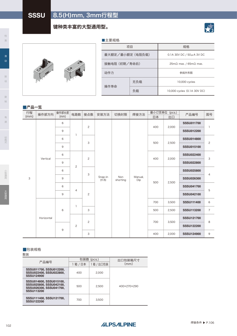 產品編號 照片 行程 操作部方向 操作部長度 電路數 接點數 動作力 安裝方法 切換時限 焊接方法 尺寸(W×D×H)