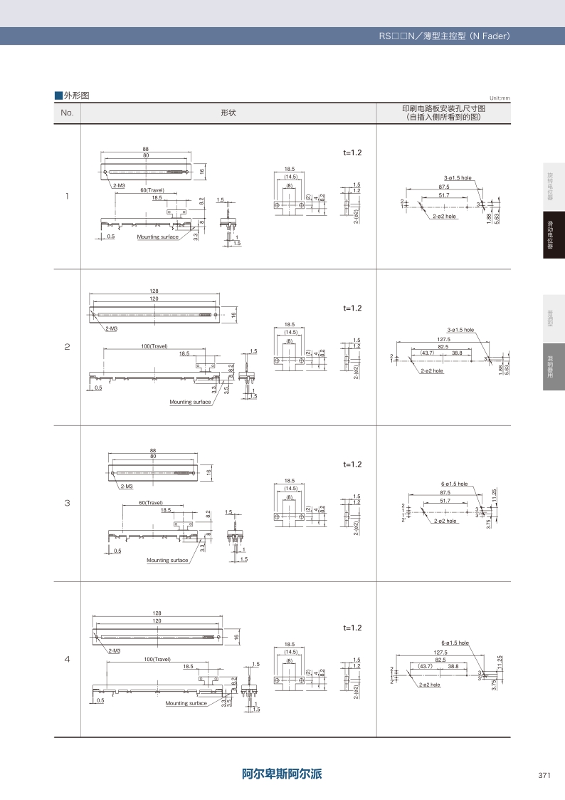 產品編號 照片 電阻體數 安裝方向 行程 操作部形狀 操作部長度 總阻值 電阻規律 端子形狀