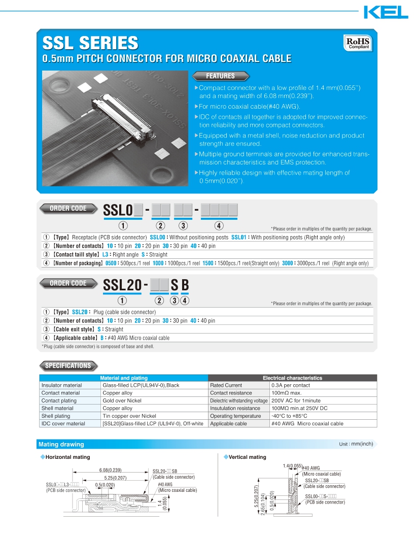 SSL系列采用0.5mm間距設計,壓接連接器,超細同軸電纜(AWG#40)型,插頭(電纜側連接器),直型。