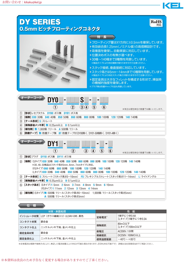 KEL浮動連接器 0.5mm間距板對板對板連接器KEL_連接器_浮動連接器.DY系列的間距為0.5mm,但在X和Y方向上可實現±0.5mm的移動間距同時還能保證1.25mm的有效嵌合高度??捎糜谲囕d多媒體、汽車液晶儀表盤、無人機云盤、LED顯示屏等。