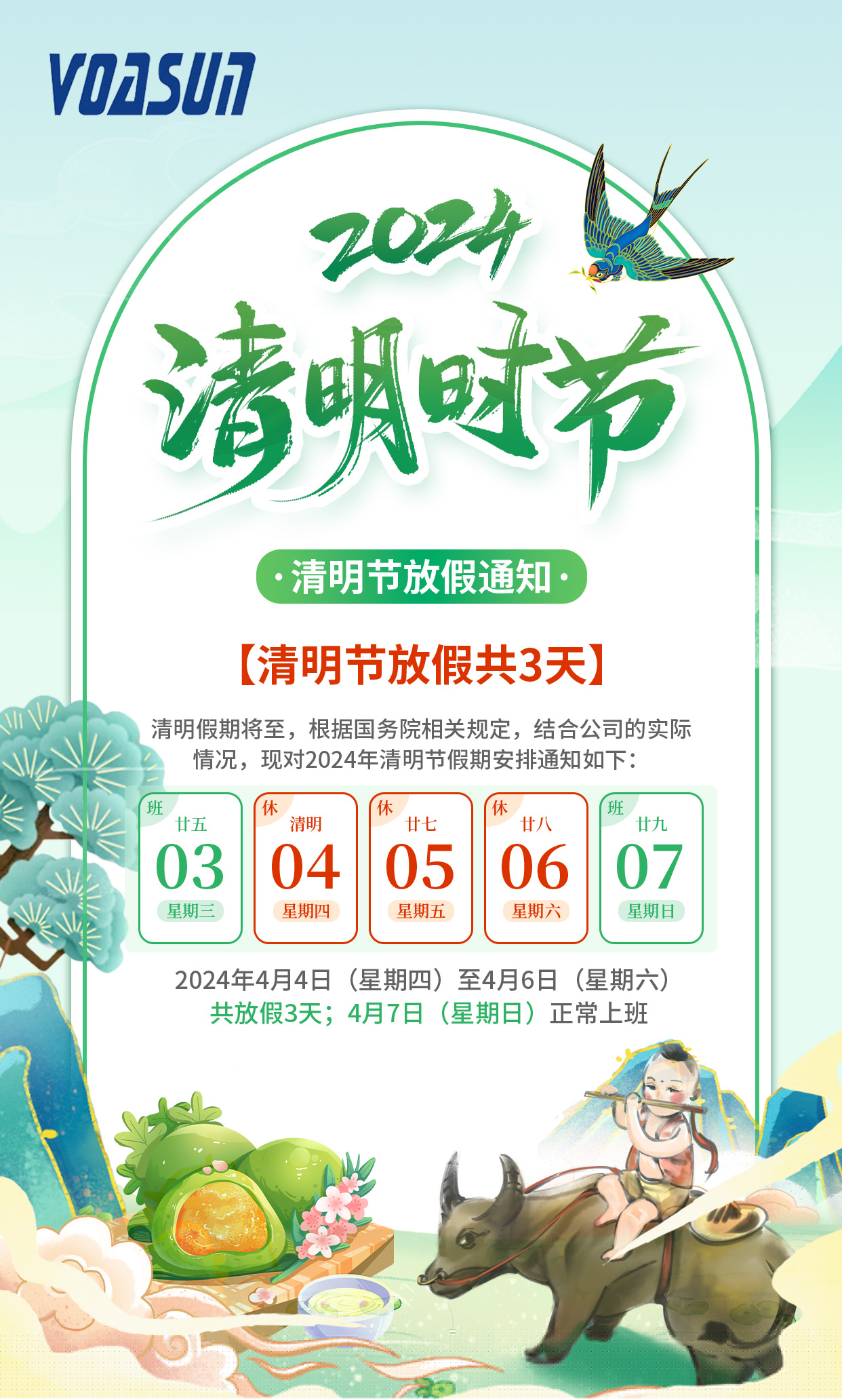 根據國家及公司相關規定,2024年清明節放假及調班安排:4月4日、5日、6日放假,共3天;4月7日(周日)上班。